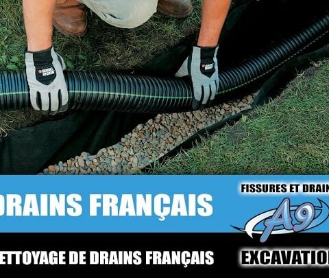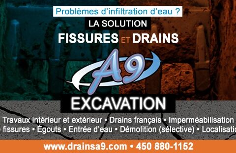 Fissures et Drains A9 Excavation vous offre des services spécialisés en installation de drain français, en réparation de fissures de fondation et bien plus! Peu importe les travaux, nous assurons une main-d’œuvre expérimentée et précise pour un résultat de qualité.