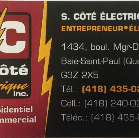 S. Côté Électrique Inc est une entreprise d’électricité située à Baie-Saint-Paul, au Québec, offrant une gamme complète de services électriques pour les secteurs résidentiel et commercial. Leurs prestations incluent l’installation, l’entretien et la réparation de systèmes électriques, le montage de lignes, l’installation de panneaux électriques, ainsi que des travaux de chauffage, notamment l’installation de systèmes Convectair.