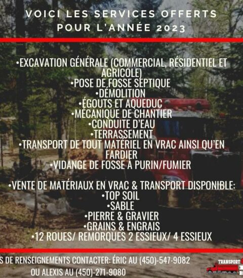 TRANSPORT ÉRIC HÉNAULT INC est une entreprise spécialisée dans l’excavation générale, le terrassement et le transport. Avec une expertise reconnue dans le secteur, elle offre des services variés pour répondre aux besoins des particuliers et des entreprises. Son équipe professionnelle utilise des équipements modernes pour garantir des travaux de qualité, respectant les délais et les normes de sécurité. Grâce à son savoir-faire, l’entreprise s’engage à fournir des solutions adaptées à chaque projet, qu’il s’agisse de chantiers résidentiels ou commerciaux.